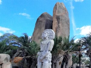 O lajedo faz uma interface com as lumiaras religiosas criadas e colocadas no local por Ariano Suassuna, quando secretário de Cultural de Pernambuco. 16 totens, esculturas – personagens sebastianistas – colocadas em círculo, algo como representando o sagrado e o profano.