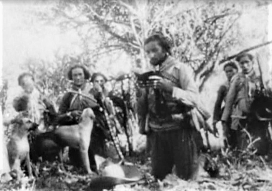 Virgulino Ferreira, Lampião, conduz reza em cena coreografada e filmada porBenjamim Abraão, em 1936
