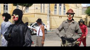 De longe nada fazia lembrar um bloco de arrasto, que surgisse na rua ou passarela ironicamente entoando a marchinha Viva Zé Pereira ( homônimo do herói do lugar), mas um ataque de um bando de mascarados militarizados brandindo seus chicotes no ar. Nem Frevo, A la Ursa, nem música baiana, nada. Apenas sons de chicotes estalando no ar.