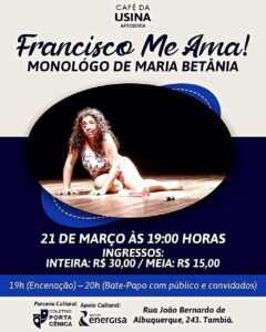 O número de feminicídios na Paraíba cresceu 30% entre 2022 e 2023, segundo dados de Segurança Pública do Ministério da Justiça; a Paraíba registrou 34 casos em 2023, em 2022 foram 26 – é desse quadro assustador que trata o espetáculo “Francisco me Ama”, monólogo interpretado pela atriz Maria Betânia, que se apresenta nesta quinta-feira, na Usina Cultural Energisa, às 19hs.