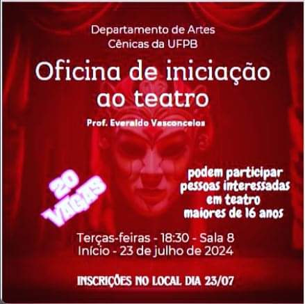 Na terça-feira, 23 de julho próximo, o Departamento de Artes da Universidade Federal da Paraíba vai oferecer uma Oficina de Iniciação Teatral que será ministrada pelo professor Everaldo Vasconcelos.