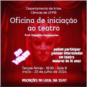 Começa nesta terça-feira, 23, no Departamento de Artes da Universidade Federal da Paraíba Oficina de Iniciação Teatral que será ministrada pelo professor Everaldo Vasconcelos. No próximo sábado, outra oficina será ministrada na Estação Ciência e Artes Cabo Branco pelo ator e diretor Flávio Melo.