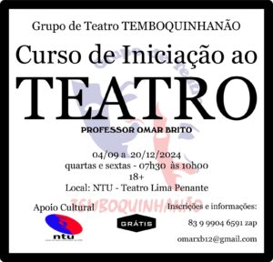 Estão abertas as inscrições para o curso de teatro com o professor Omar Brito, diretor de teatro da Cia de Teatro Temboquinhanão e roteirista e diretor de cinema documental no Núcleo de Teatro da UFPB, que é responsável pela aplicação da política de extensão cultural da Pró-Reitoria Para Assuntos Comunitários da UFPB.