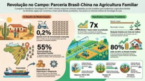 O que levava dois meses de trabalho manual em Apodi, no sertão do Rio Grande do Norte, passou a ser feito em uma semana. Nos últimos dois anos, 62 máquinas agrícolas chinesas, entre tratores, semeadeiras, colheitadeiras e drones, foram testadas, ajustadas e adaptadas às condições do semiárido nordestino por estudantes chineses e agricultores locais trabalhando lado a lado. A renda das famílias quase dobrou. Em Russas (CE), 42 famílias viram a produtividade do milho subir 40% com metade das sementes. Em Itapecuru Mirim (MA), uma colheita de arroz que exigia até 25 dias de trabalho manual passou a ser concluída em oito horas. O ponto de partida foi o diagnóstico da professora Yang Minli, da Universidade Agrícola da China (UAC): apenas 0,2% dos agricultores familiares nordestinos usam equipamentos avançados, numa região que concentra 55% de todos os agricultores familiares do Brasil e 38% de toda a população rural do país, segundo o IBGE.