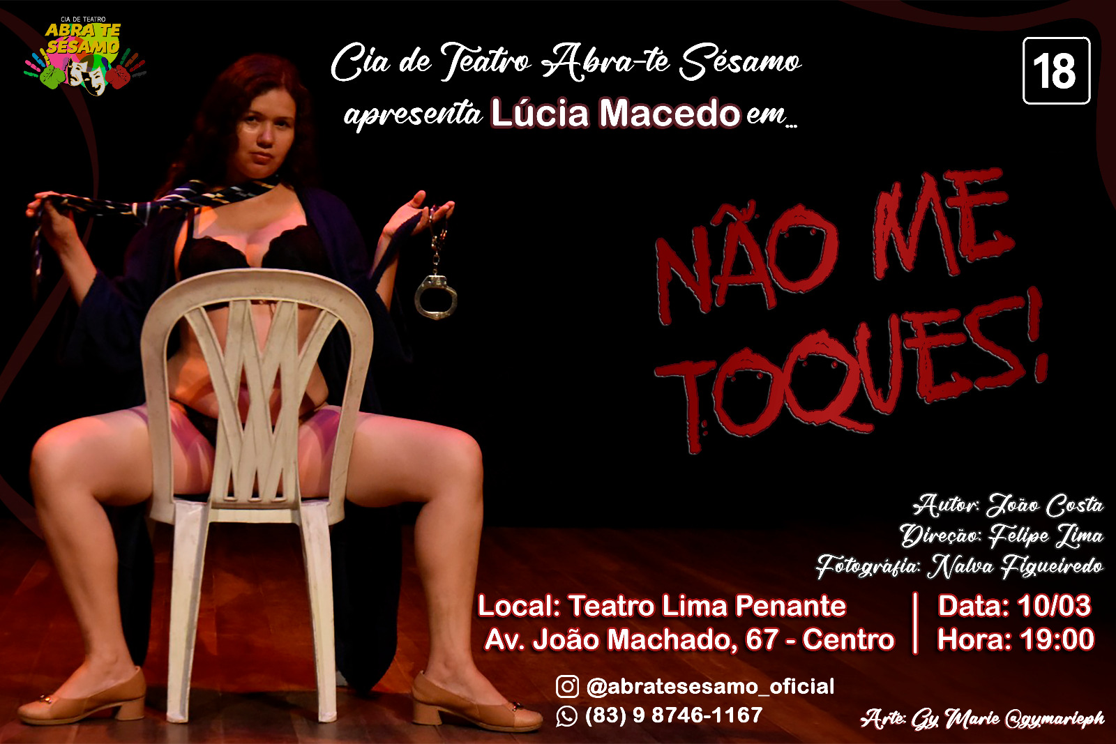 “Não Me Toques”, monólogo interpretado pela atriz paraibana Lúcia Macedo com direção de Felipe Lima, estreia nesta sexta-feira, às 19; 30 Horas, no Teatro Lima Penante dentro da programação alusiva ao Dia Internacional da Mulher; numa encenação da Cia Teatral Abra-te Sésamo, texto de autoria de João Costa. Entrada Franca.